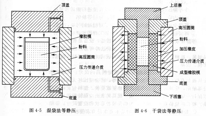 冷等靜壓又分為濕袋法和干袋法兩種等靜壓。濕袋法等靜壓是將粉料先放入成型模具(即包套)內,經密封后再置于高壓缸中進行壓制。在壓制過程中,包套完全浸入液體,與壓力傳遞介質直接接觸。濕袋法等靜壓適用性強,尤其適合用于實驗研究和小批量生產,并可同時在一個高壓缸內壓制兩種以上不同形狀的制件及生產大型和形狀復雜的制件,生產流程短且成本低廉。濕袋法等靜壓的模具及坯料的放置方式如圖4-5所示。